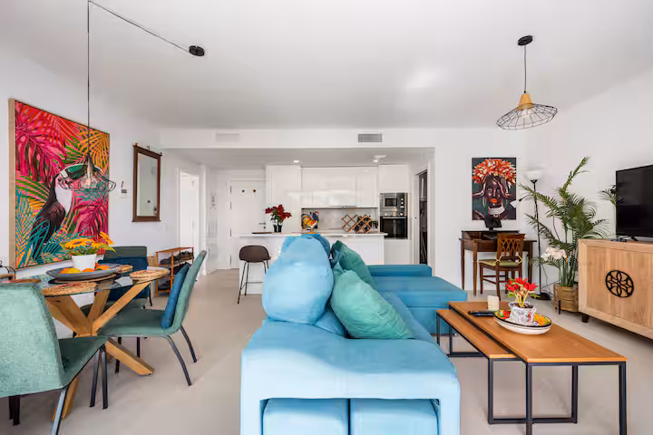 The open-plan living and dining space is generous and bright, with a fully equipped modern kitchen, large TV with Netflix and Amazon Prime, and a dedicated workspace with an ergonomic chair — ideal for anyone working remotely.